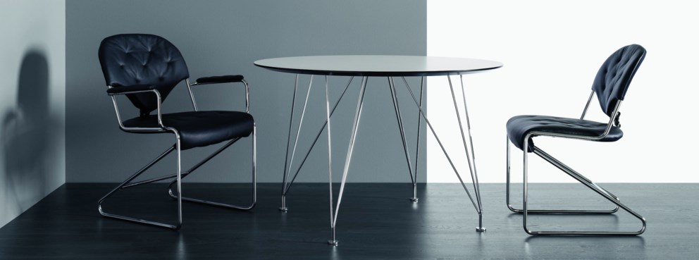 A classic round table in chrome with a glass top.